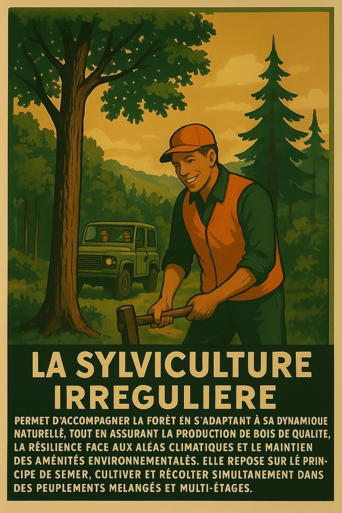 As the Comité des Forêts explains, “Irregular silviculture allows the forest to be accompanied in adapting to its natural dynamics, while ensuring the production of quality wood, resilience to climatic hazards, and the maintenance of environmental amenities. It is based on the principle of sowing, cultivating, and harvesting simultaneously in mixed, multi-layered stands.”