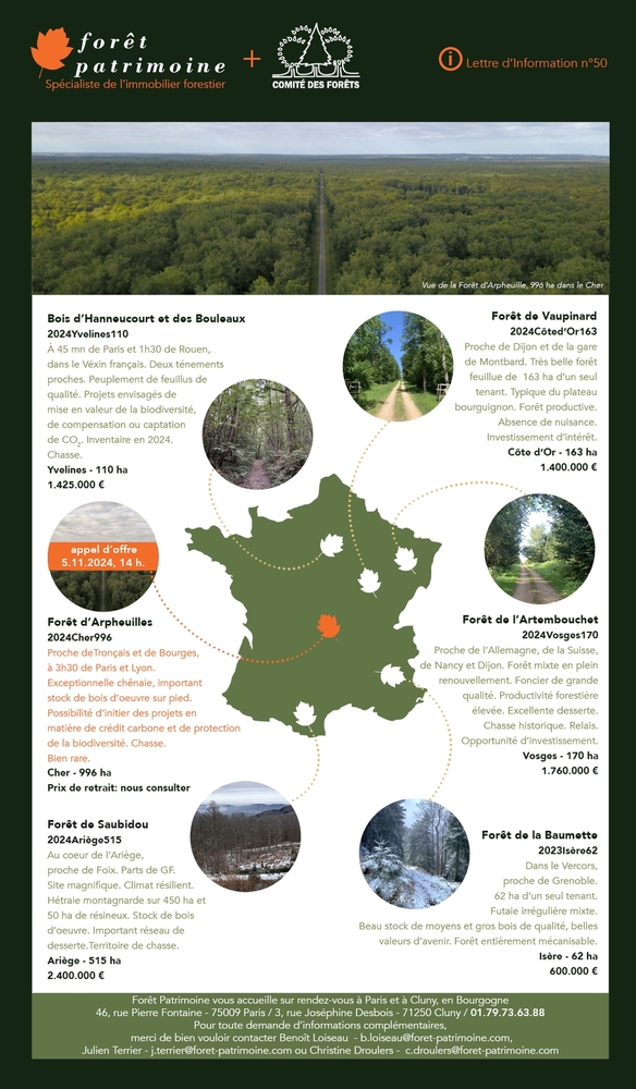 Les dernières offres de forêts aux quatre coins de la France.Massifs de 60 à près de 1.000 hectares à vendre de gré à gré ou par appel d'offres.